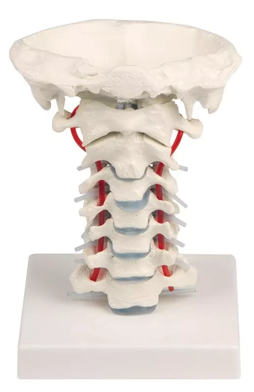 C1 bis C7 sowie ein Segment der Schädelbasis sind beweglich montiert. Mit Rückenmark und austretenden Spinalnerven. Alle Bewegungen der Halswirbelsäule und der Kopfgelenke können demonstriert werden. Mit abnehmbarem Ständer.