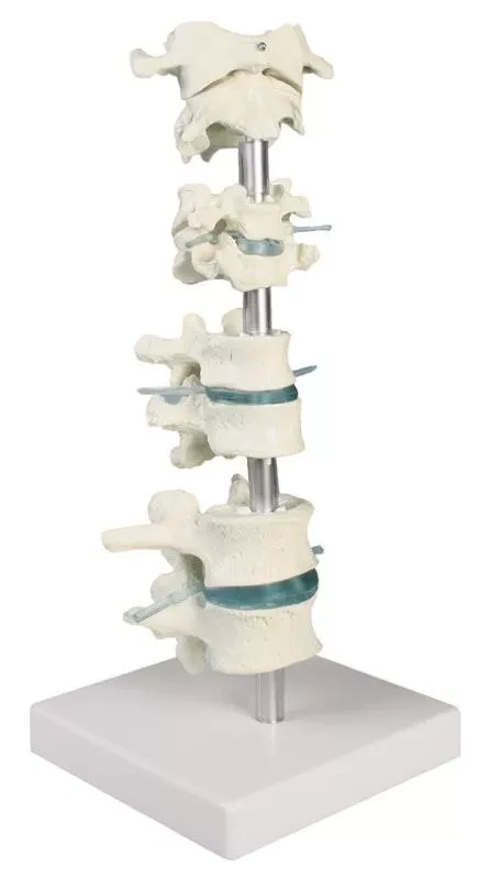2 Lendenwirbel, 2 Brustwirbel, 2 Halswirbel sowie Atlas und Axis sind lose auf Gummi aufgefädelt und bieten die Möglichkeit, jeden einzelnen Wirbel detailliert zu studieren. Alle Strukturen, Gelenkflächen, Vorsprünge etc. sind erkennbar. Auf einem Stativ, montiert mit Bandscheiben.