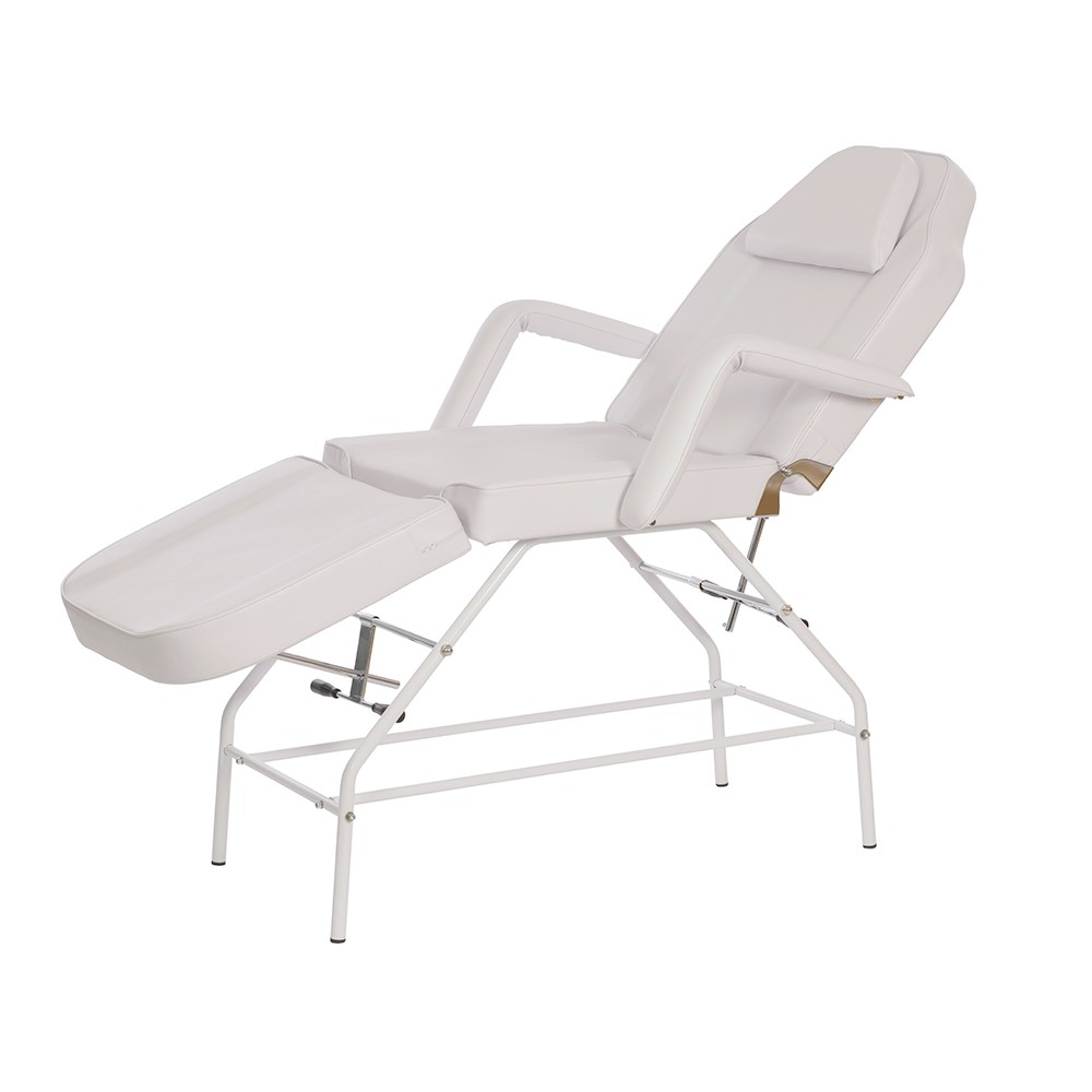 3-teilige Sitzbank mit abnehmbaren Armlehnen. Kopfstützenkissen mit Belüftungsöffnung. Metallstruktur mit weiß lackierter Oberfläche. Leicht zu reinigende weiße PVC-Polsterung.