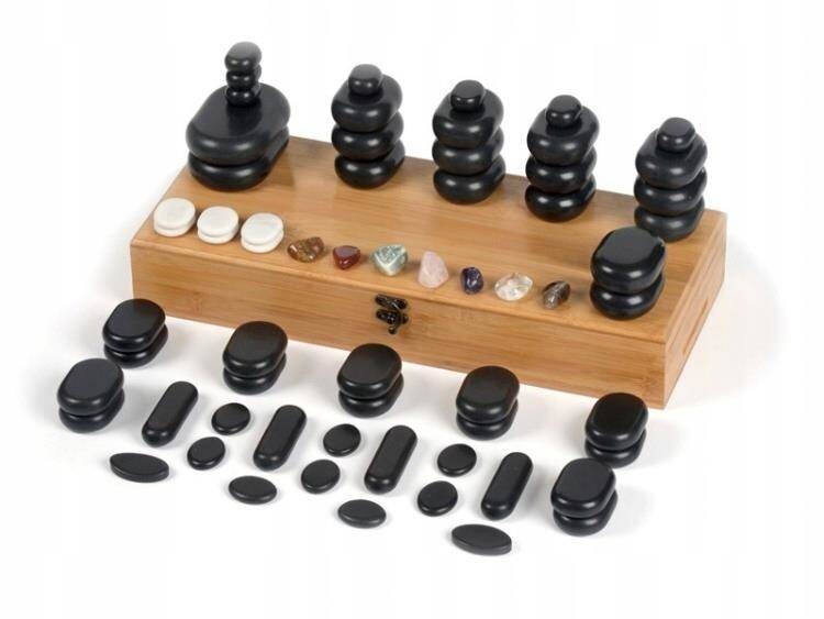 Set aus 64 Basaltsteinen. Die Schachtel enthält einen ganzen ovalen und flachen Stein von mehreren Dimensionen: 2 extra große Steine (Kreuzbein und Solarplexus), 14 große (Rücken und Oberschenkel), 14 mittlere (Hände, Arme, Waden, Füße und Nägel), 7 kleine Kopf und Hinterkopf), 8 Zehen, 4 tiefe Gewebe, 2 Konturen (für die Augen) und 6 Marmorsteine für die Kältetherapie. 7 Chakra-Steine sind ebenfalls enthalten.