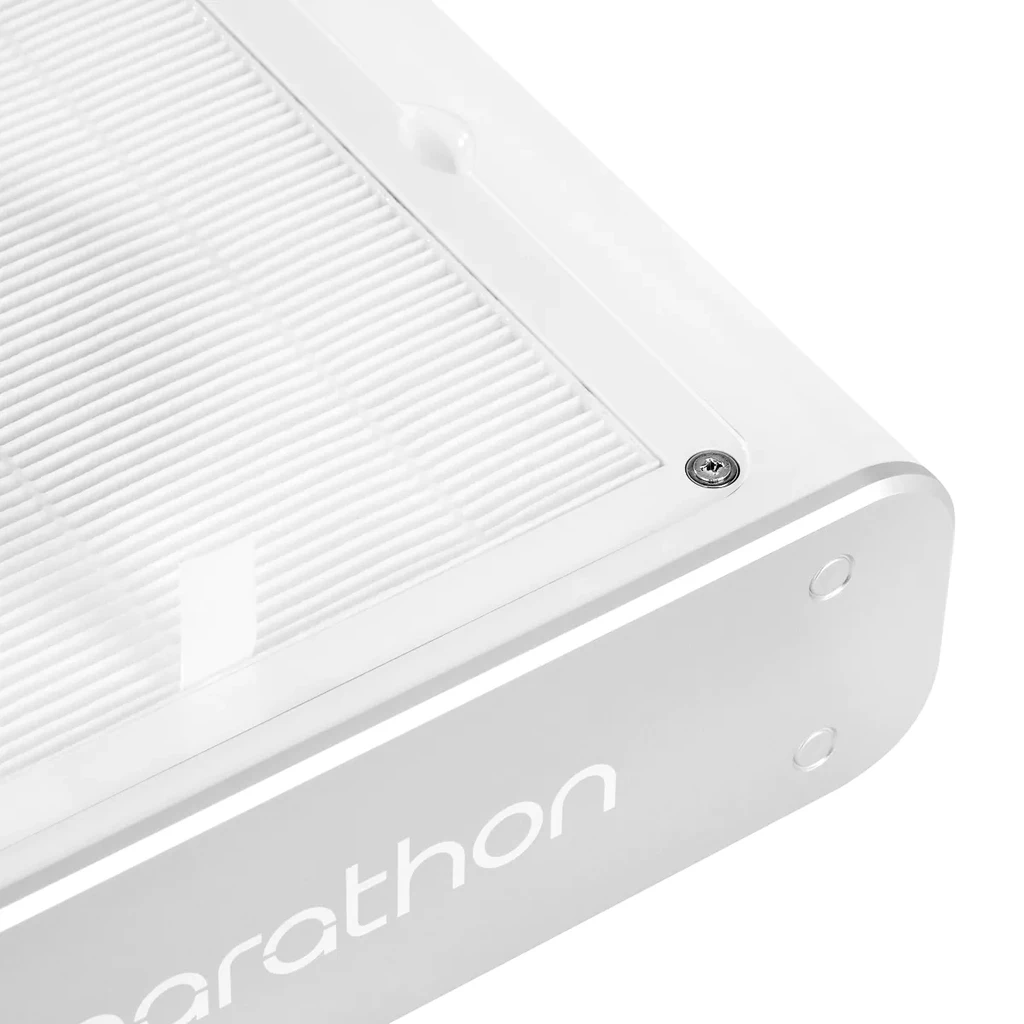 Das aerodynamische weiße Gehäuse und das chromfarbene Magnetgitter verleihen dem Marathon Olimp ein modernes und stilvolles Aussehen, das in jede professionelle Umgebung passt. Das Design ist nicht nur ästhetisch – das magnetische Gitter sitzt sicher an seinem Platz und lässt sich zur Reinigung leicht abnehmen.