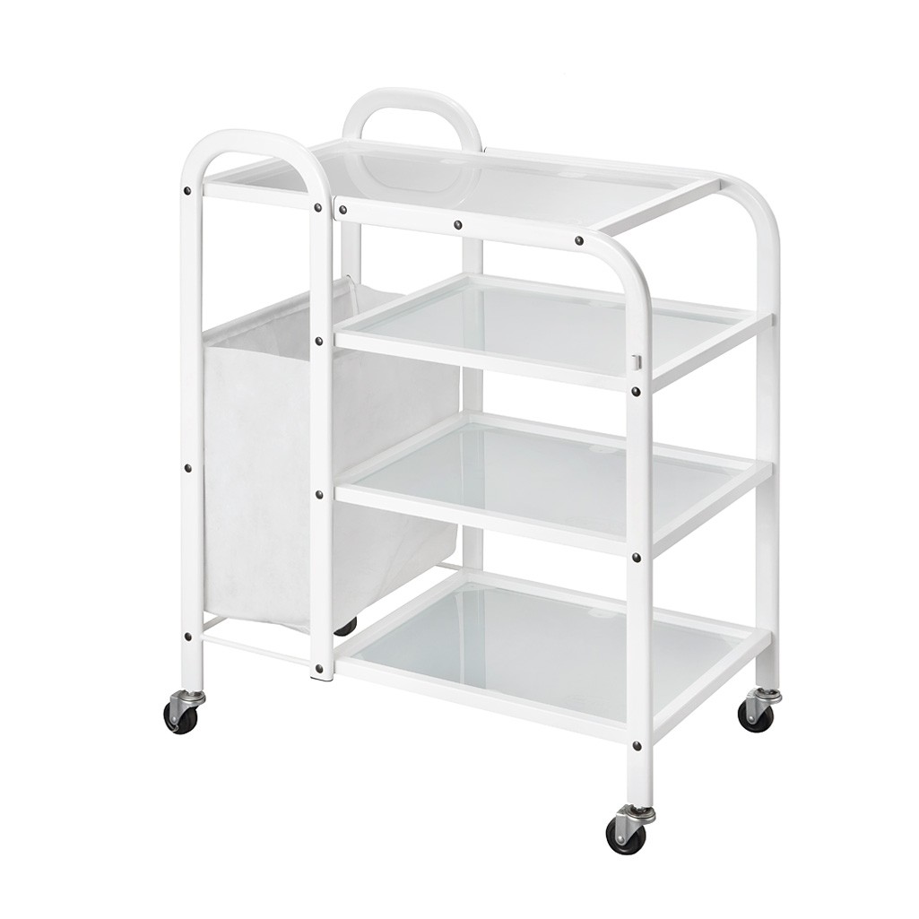Metallwagen für Schönheitsprodukte in weißer Farbe mit modernem und praktischem Design. Es ist mit 4 Ablagen und einer Tasche an der Seite ausgestattet. Volle Mobilität dank 4 Rädern.
